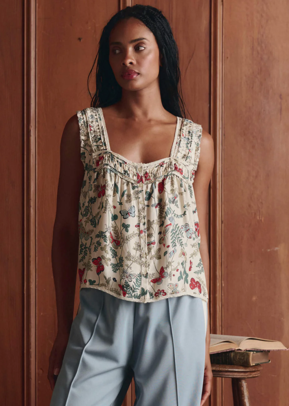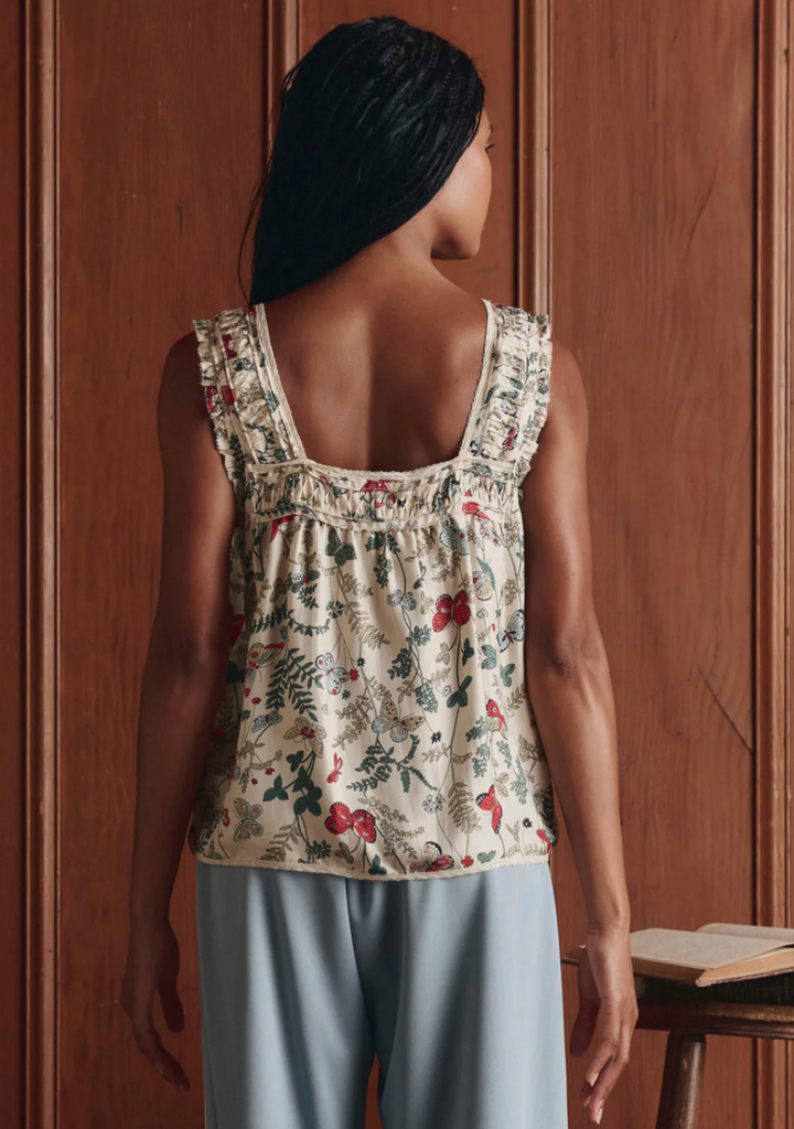 The Victorian Pleat Tank features pintuck and pleat detailing at the front and back neckline and shoulders, creating a refined, textured look. It has a square neckline trimmed with delicate cotton lace, a front button placket with shirting buttons, and scooped armholes with ruffle edges and a picot finish for added charm. The flowy silhouette is crafted from lightweight, silk twill and adorned with Spring’s Floating Butterfly Print.